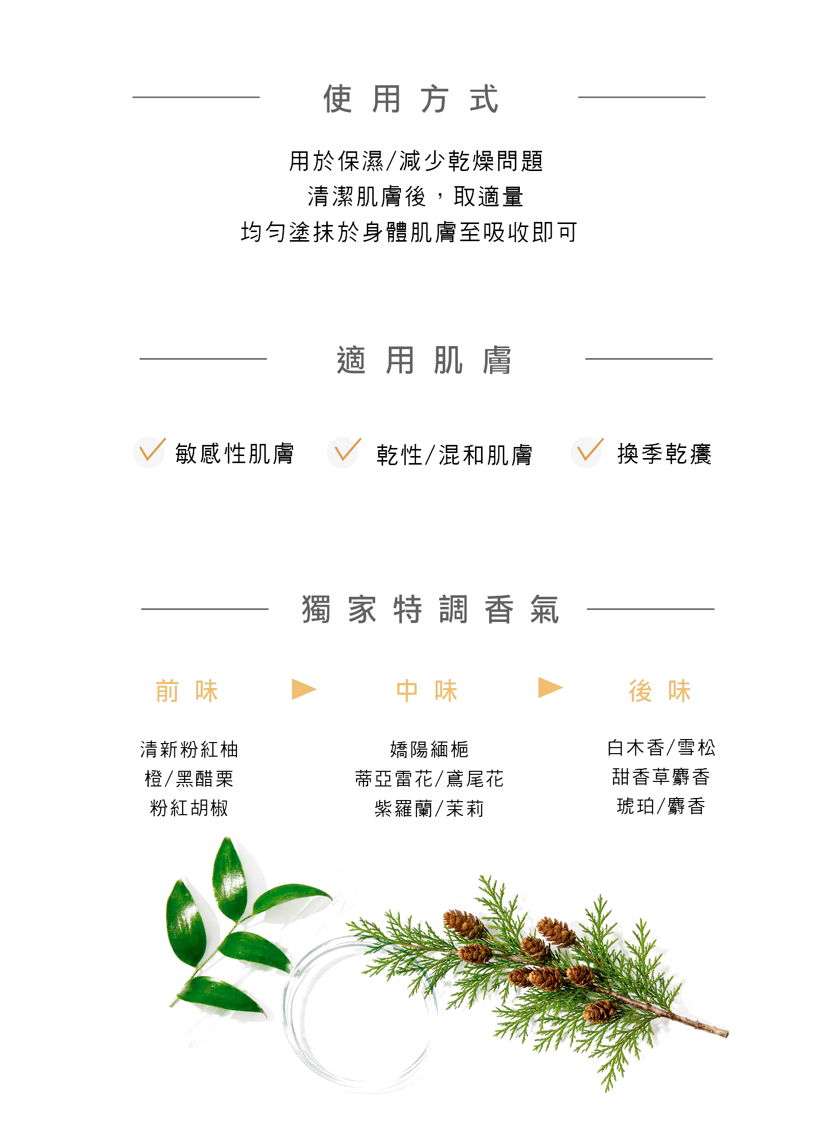 沐浴後取適量,均勻塗抹於全身肌膚並輕柔按摩至吸收。